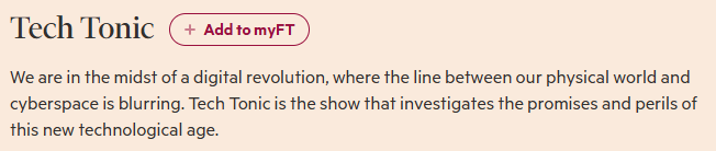 - Tech Tonic. Zo'n twee keer per jaar komt de Financial Times met een podcastserie die 'het' onderwerp van dat moment doorlicht op het gebied van tech. Van AI, tot de tech-macht van China, of (nu) de relatie tussen de verschillende 'tech bro's' en Trump. Hier merk je de kracht van een goed journalistiek merk: scherp oog voor de trends van het moment, mooie reportages, goed geïnformeerde journalisten, mooie montage.