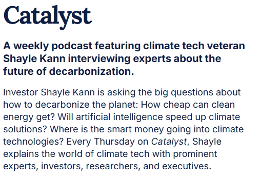 - Catalyst. De Amerikaanse durfinvesteerder Shyle Kann wil graag geld verdienen aan de energietransitie. Maar dan moet je wel weten wat de grote trends zijn en welke nieuwe technieken wel/niet kans maken. Die praktische insteek maakt dit een fijne podcast. Hij spreekt niet met bekende namen, maar met mensen met verstand van één bepaald thema. Ook leuk: je krijgt meer inzicht in bijvoorbeeld de staat van het Amerikaanse stroomnet en denkt dan: oh, zo slecht doen we het in Nederland niet eens.