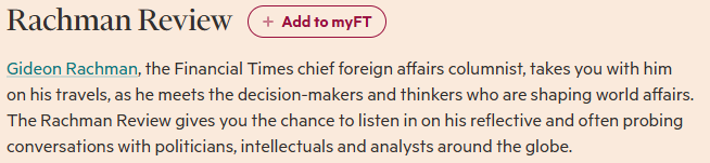 - The Rachman Review. Nog een podcast van de FT, dit keer over de grote thema's . Journalist Gideon Rachman wordt gerespecteerd en krijgt dus serieuze gasten in zijn podcast, waar hij in korte tijd de diepte mee in gaat.