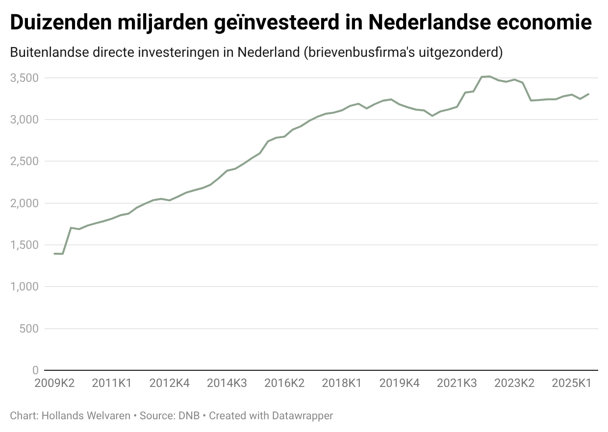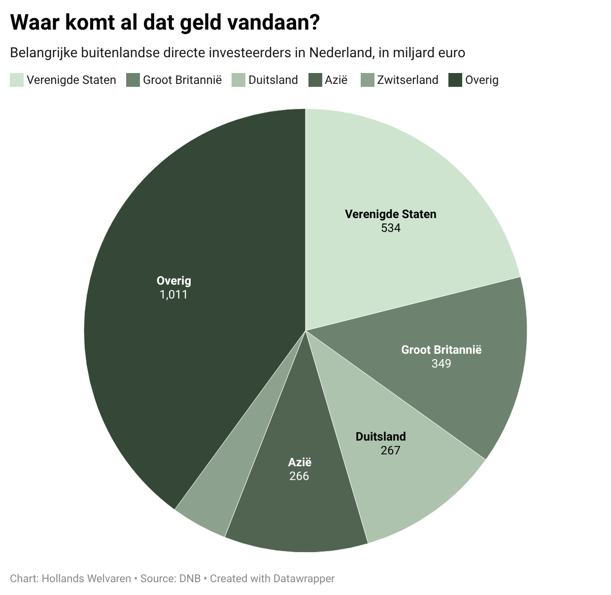 Natuurlijk, Nederlandse multinationals zijn belangrijk voor onze economie, maar buitenlandse multinationals zijn veel belangrijker. Zij hebben 3.302 miljard euro in Nederlandse fabrieken, datacentra, kantoren en andere zaken gestoken, blijkt uit cijfers van De Nederlandsche Bank (DNB). Brievenbusfirma's zijn hiervan uitgesloten.