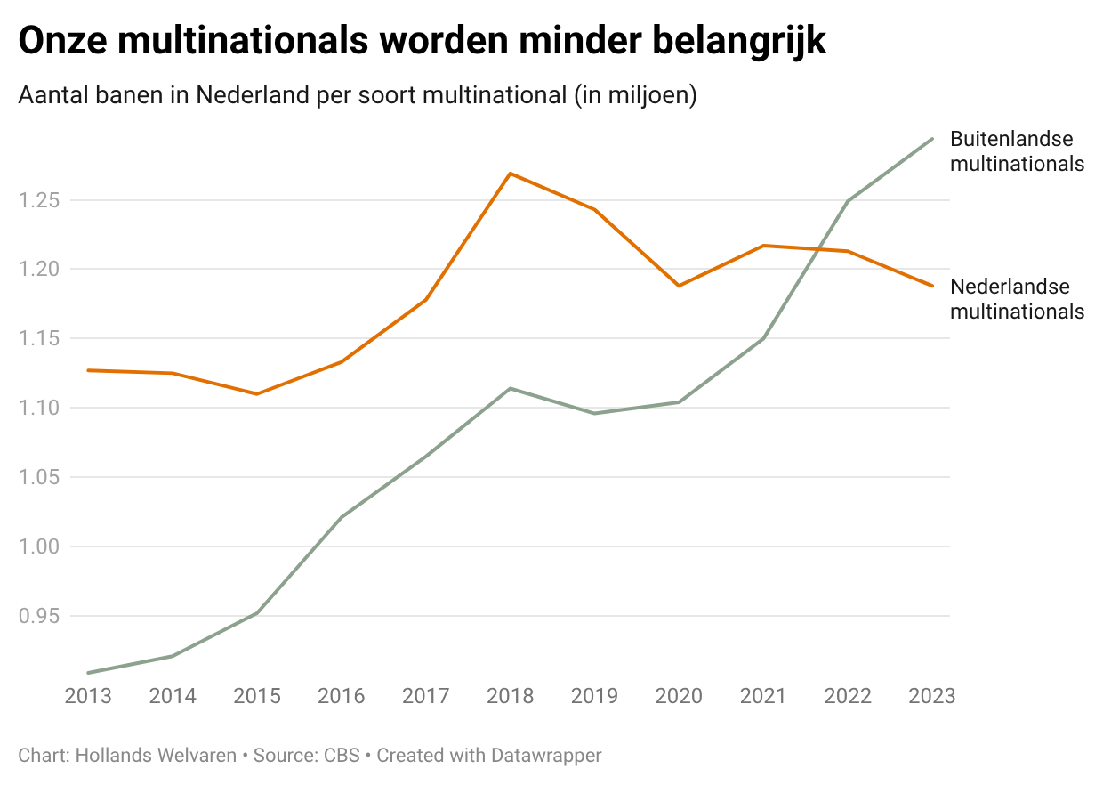 Er zijn bijna 18.000 buitenlandse multinationals actief in ons land, becijferde het Centraal Bureau voor de Statistiek (CBS). Samen hebben zij 1,3 miljoen mensen in dienst. Daarmee hebben zij sinds een paar jaar meer mensen in dienst dan Nederlandse multinationals.