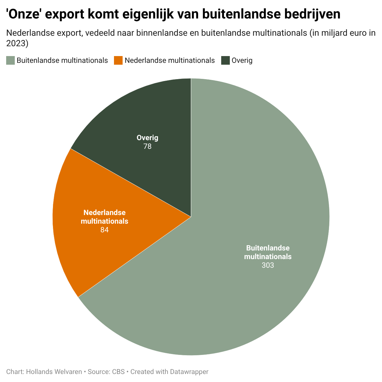 Dat zie je ook terug in onze exportcijfers. Zo'n tweederde van wat Nederland exporteert, komt van buitenlandse multinationals, blijkt uit CBS-cijfers.