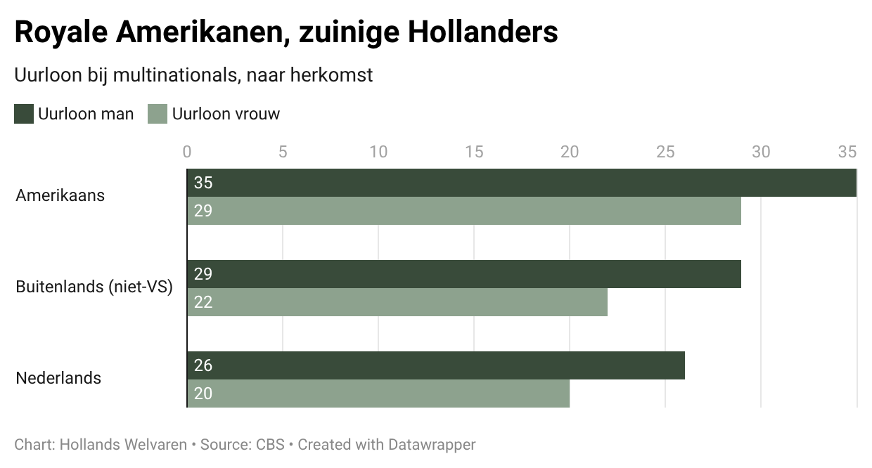 Én ze betalen ook nog eens beter. Medewerkers verdienen per uur 9 euro meer dan bij een Amerikaanse dan bij een Nederlandse multinational, berekende het CBS. Niet omdat Amerikanen zoveel socialer zijn, maar omdat er simpelweg veel meer geld wordt verdiend bij Amerikaanse bedrijven. In de loop der jaren hebben diverse Amerikaanse tech-bedrijven ervoor gekozen om hun Europese hoofdkantoor in Nederland te vestigen, vaak in Amsterdam. Denk aan Uber, Netflix en Tesla. Het voordeel: als zo'n bedrijf snel groeit, groeit Nederland vrijwel automatisch mee.