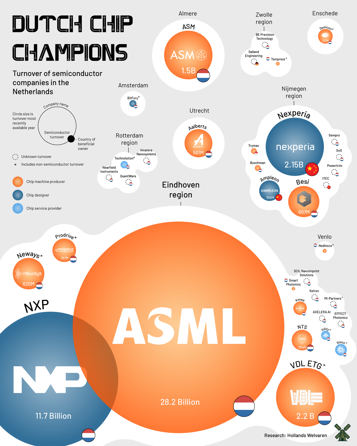 Nederland heeft de belangrijkste chipindustrie van Europa, maar de exacte grote ervan is onbekend. Hollands Welvaren zette daarom de belangrijkste spelers op een rij. ASML is verreweg de grootste, maar die is sterk afhankelijk van de veel kleinere spelers in Nederland.