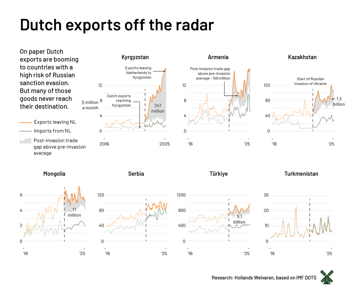Sinds de Russische invasie van Oekraïne is voor miljarden euro’s aan Nederlandse export van de radar verdwenen. Op papier gaan de goederen naar landen met een verhoogd risico op sanctieomzeiling. In de praktijk verdwijnen ze zelfs nog voordat ze daar aankomen.