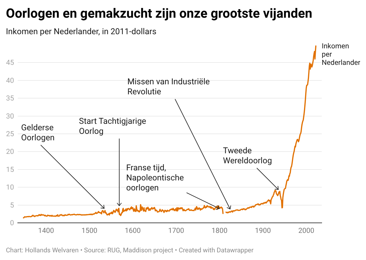 Kijk naar onderstaande grafiek met het inkomen van de gemiddelde Nederlander sinds 1348 (!) en zoek de Gouden Eeuw. Die zie je niet. De gegevens komen van het indrukwekkende Maddison-project van de Rijksuniversiteit Groningen. Daarin zie je ook dat de term 'wederopbouw' volstrekt onterecht is. We bouwden niet 'weder' op, maar werden welvarender dan ooit tevoren.