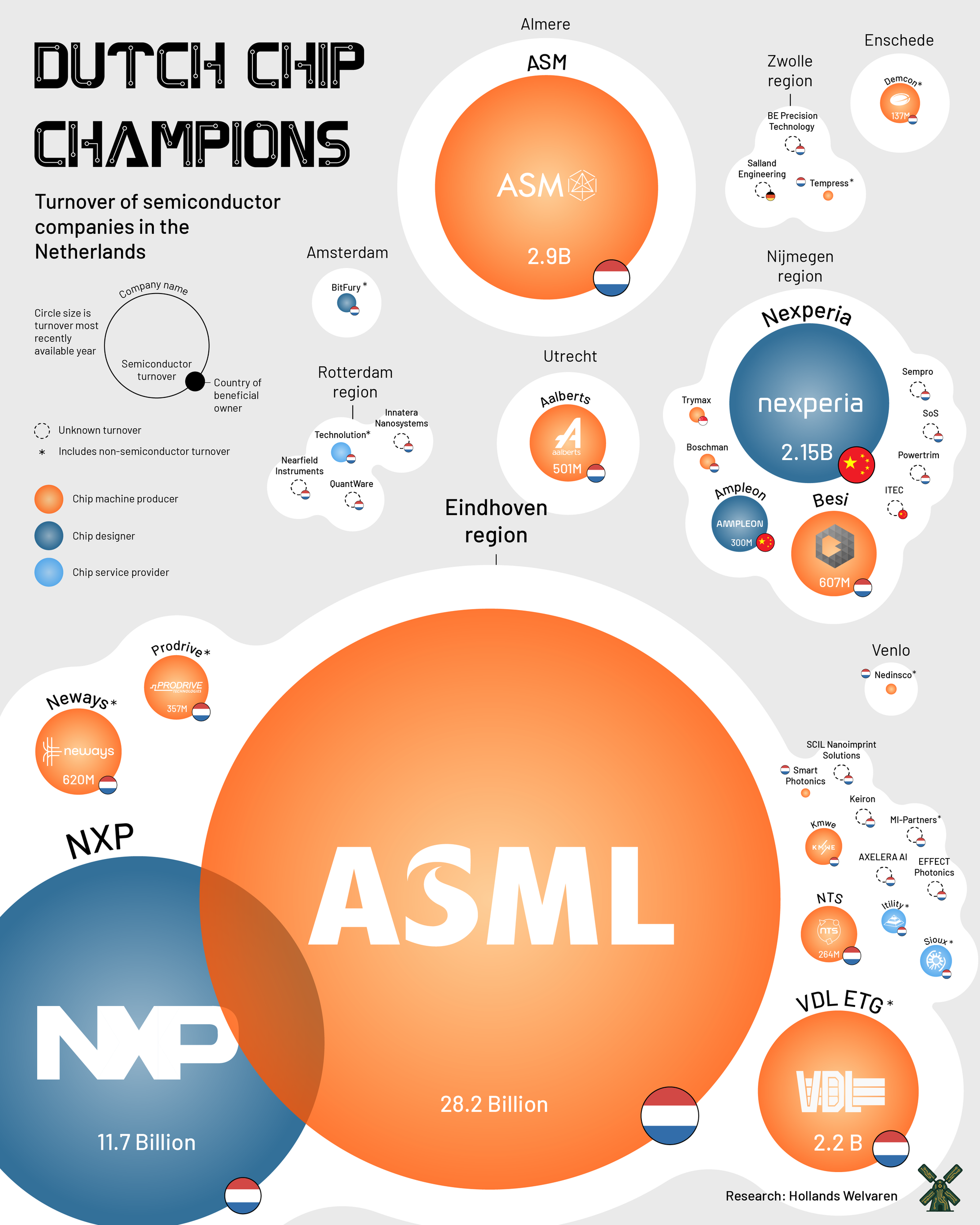 Heel grofweg zijn er drie soorten spelers. Er zijn de designers die chips ontwerpen. Denk aan Apple dat werkt aan een nog hippere iPhone, of Nvidia dat de meest geavanceerde AI-chips ter wereld verzint. Deze bedrijven maken deze chips echter niet zelf. Dat gebeurt in gigantische fabrieken (vaak een foundry, of fab genoemd), zoals die van TSMC (Taiwan), Intel (Amerika) en Samsung (Zuid-Korea). Maar die fabrieken kunnen die chips alleen maken met de meest geavanceerde machines van machinemakers. En in dat laatste blinkt Nederland uit (zie de oranje bedrijven in de infographic hierboven).