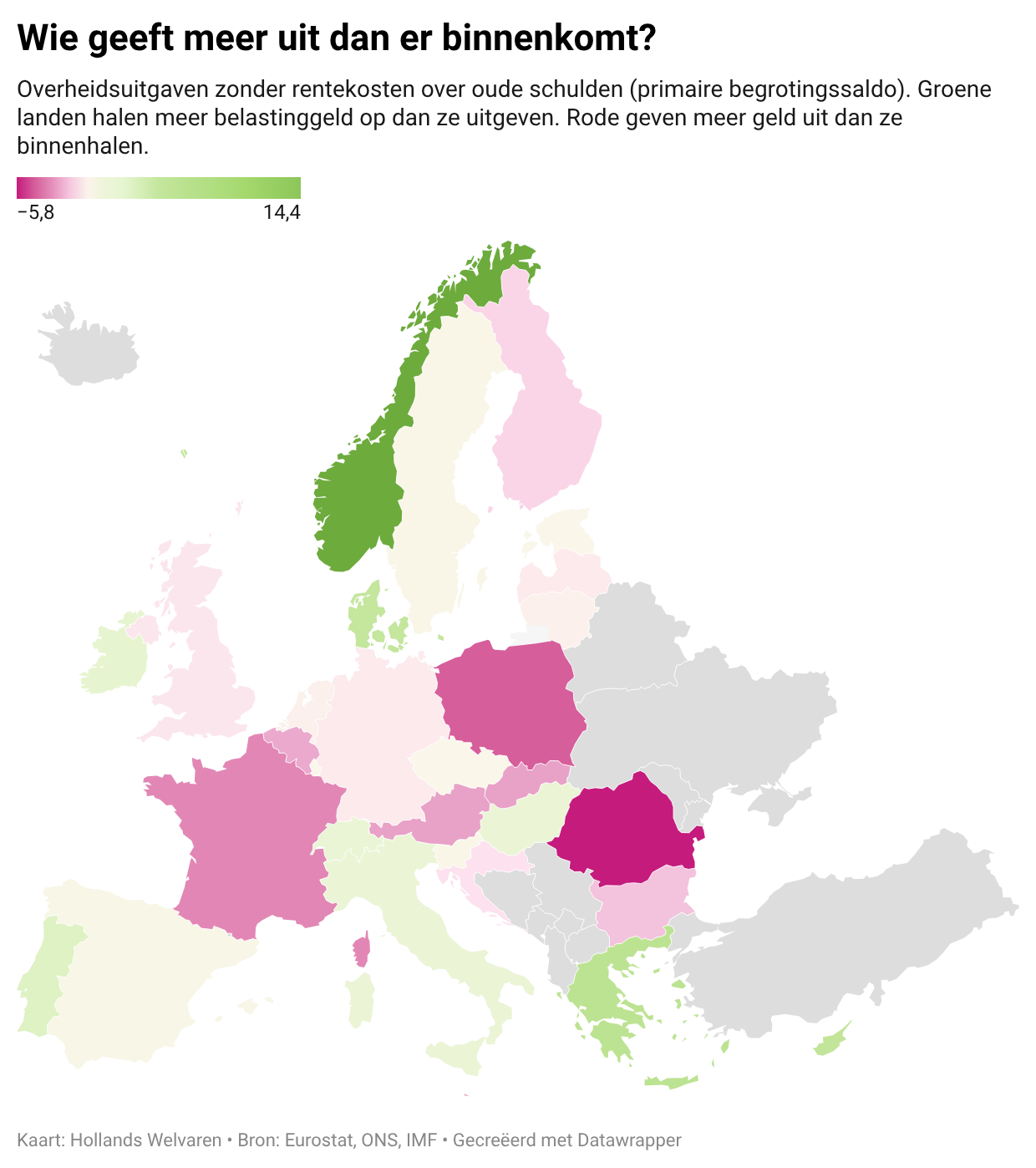 Onvermijdelijk is dat allemaal niet. Het is een specifiek Nederlandse laksheid. Kijk je naar andere kleine, rijke Europese landen, dan gaan zij wél verstandig om met hun geld. Op onderstaande kaart is het zogeheten primaire begrotingssaldo van Europese landen weergegeven. Dat zijn alle overheidsuitgaven, min de rentelasten. Zo kijk je of de huidige uitgaven kunnen worden gedekt door de huidige inkomsten en filter je rentelasten door verkwistende voorgaande generaties eruit (zoals voor Italië).