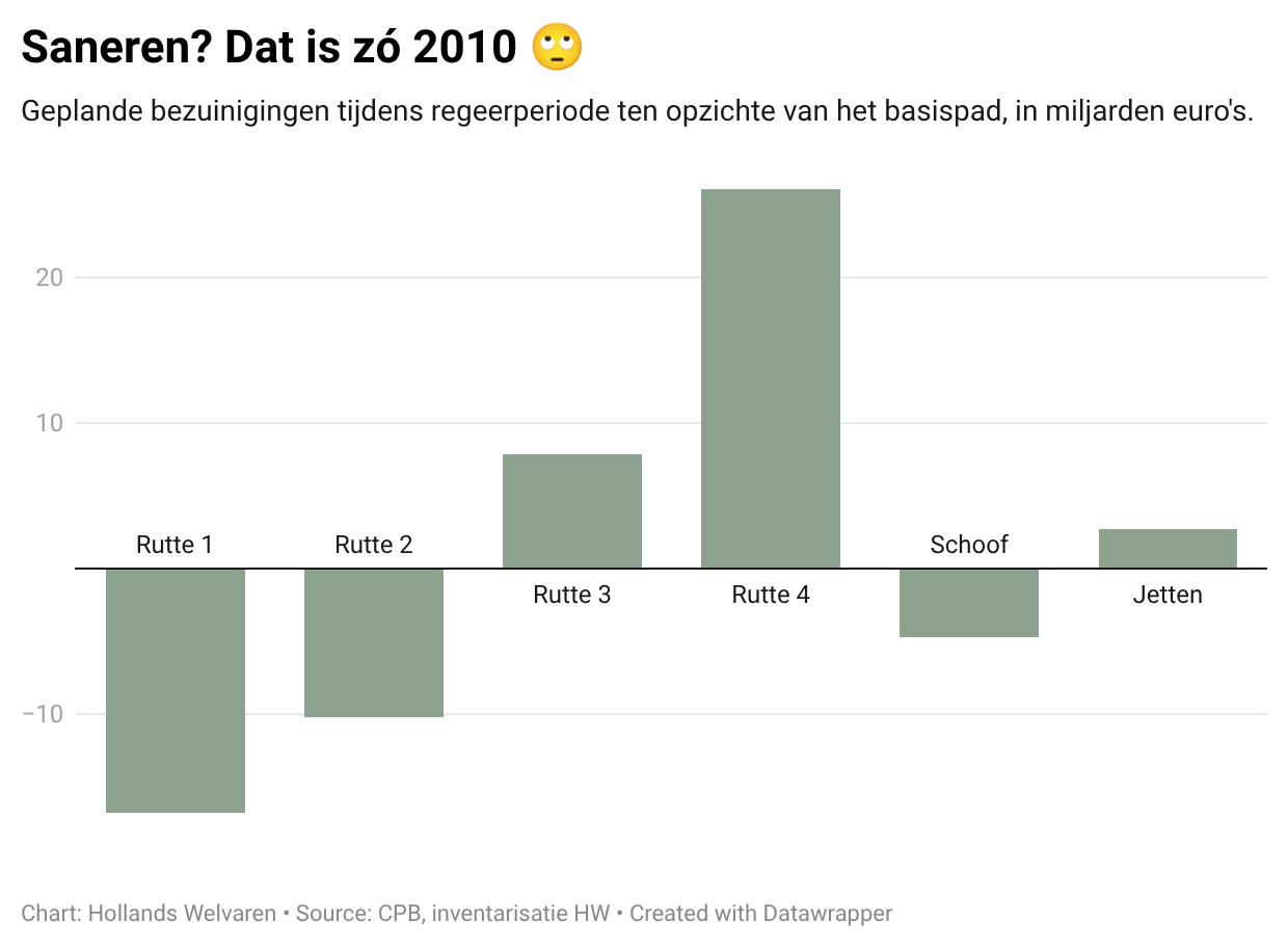 Later in 2012 sloten VVD en PvdA nog een regeerakkoord waarin nog flink verder werd bezuinigd. Maar sindsdien lijkt het erop dat niemand in Den Haag nog met een bijl - of de kettingzaag - gezien wil worden. Coalitieakkoorden zijn er sindsdien vooral voor om nog méér geld uit te geven.