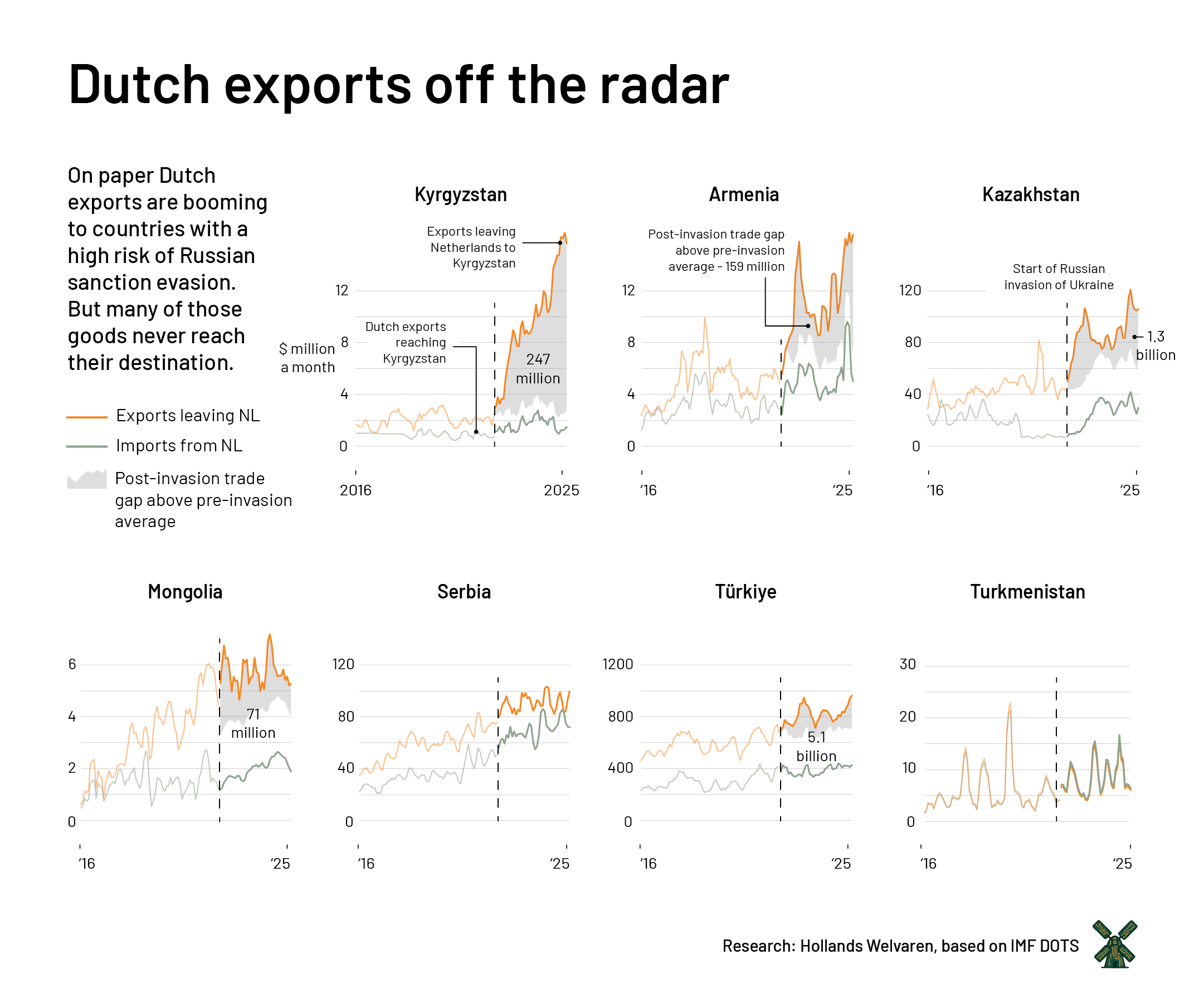 Sinds de Russische invasie van Oekraïne is voor miljarden euro's aan Nederlandse export van de radar verdwenen. Op papier gaan de goederen naar landen waarvan bekend is dat er een groot risico is dat ze gesanctioneerde goederen doorsluizen naar Rusland. Maar in de praktijk verdwijnen de goederen zelfs nog voordat ze in die doorsluislanden aankomen. Dat blijkt uit data-onderzoek van Hollands Welvaren op basis van data van het Internationaal Monetair Fonds.