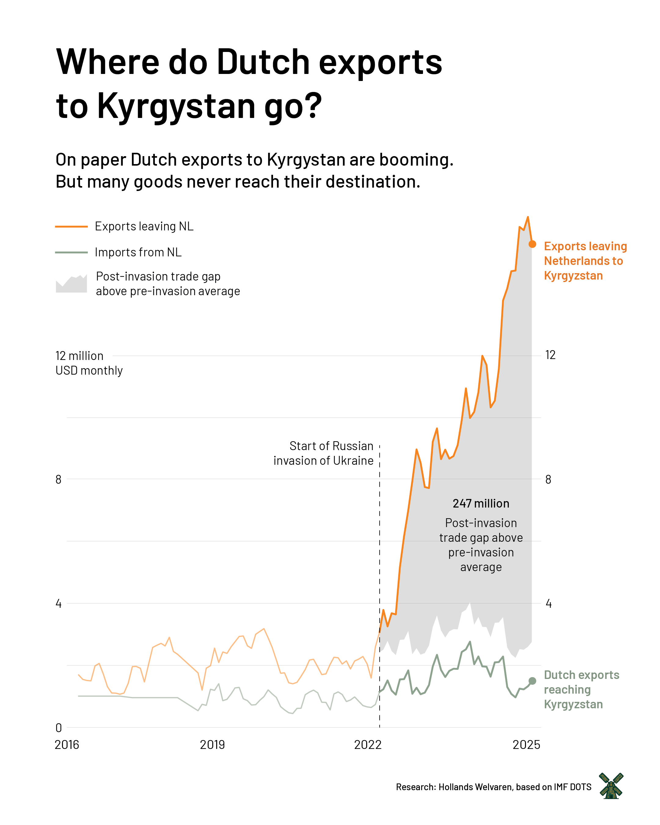 Bovenop het gebruikelijke 'gat' dat altijd al bestond tussen de Nederlandse export- en Kirgizische importcijfers, is er sinds de Russische inval bijna 250 miljoen dollar aan Nederlandse export naar Kirgizië 'kwijtgeraakt', nog voordat het in dat land aankwam.