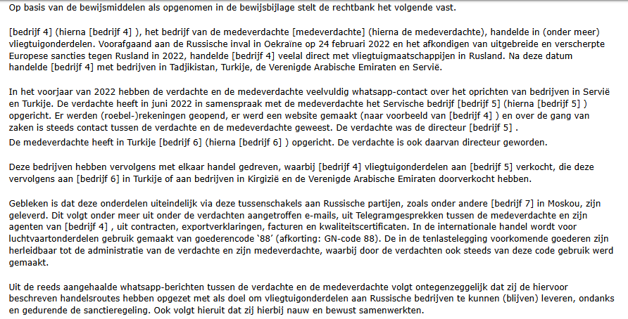 Uit diverse rechtszaken blijkt echter dat er ook Nederlandse ondernemers zijn die willens en wetens schijnconstructies opzetten naar die risicolanden, met de bedoeling om de spullen uiteindelijk in Rusland te krijgen. Dat mag, uiteraard, niet. Hoe dat in de praktijk werkt, kun je lezen in onderstaand fragment uit een gerechtelijke uitspraak van de Rechtbank Rotterdam.
