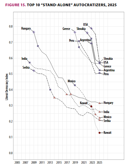 Rond de millenniumwisseling was die situatie nog heel anders: de helft leefde in een democratie en autocraten waren op hun retour. Maar nu valt de ene democratische 'vriend' na de andere af. In Hongarije en India ging het democratisch verval gestaag, in Amerika nu razendsnel, volgens het V-Dem Institute.
