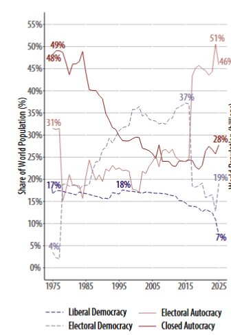 Nog maar 600 miljoen mensen (7% van de wereldbevolking) leven volgens het instituut in een liberale democratie zoals de onze, met eerlijke verkiezingen en vrijheid van meningsuiting. Driekwart van de mensen leeft zelfs in een autocratie.